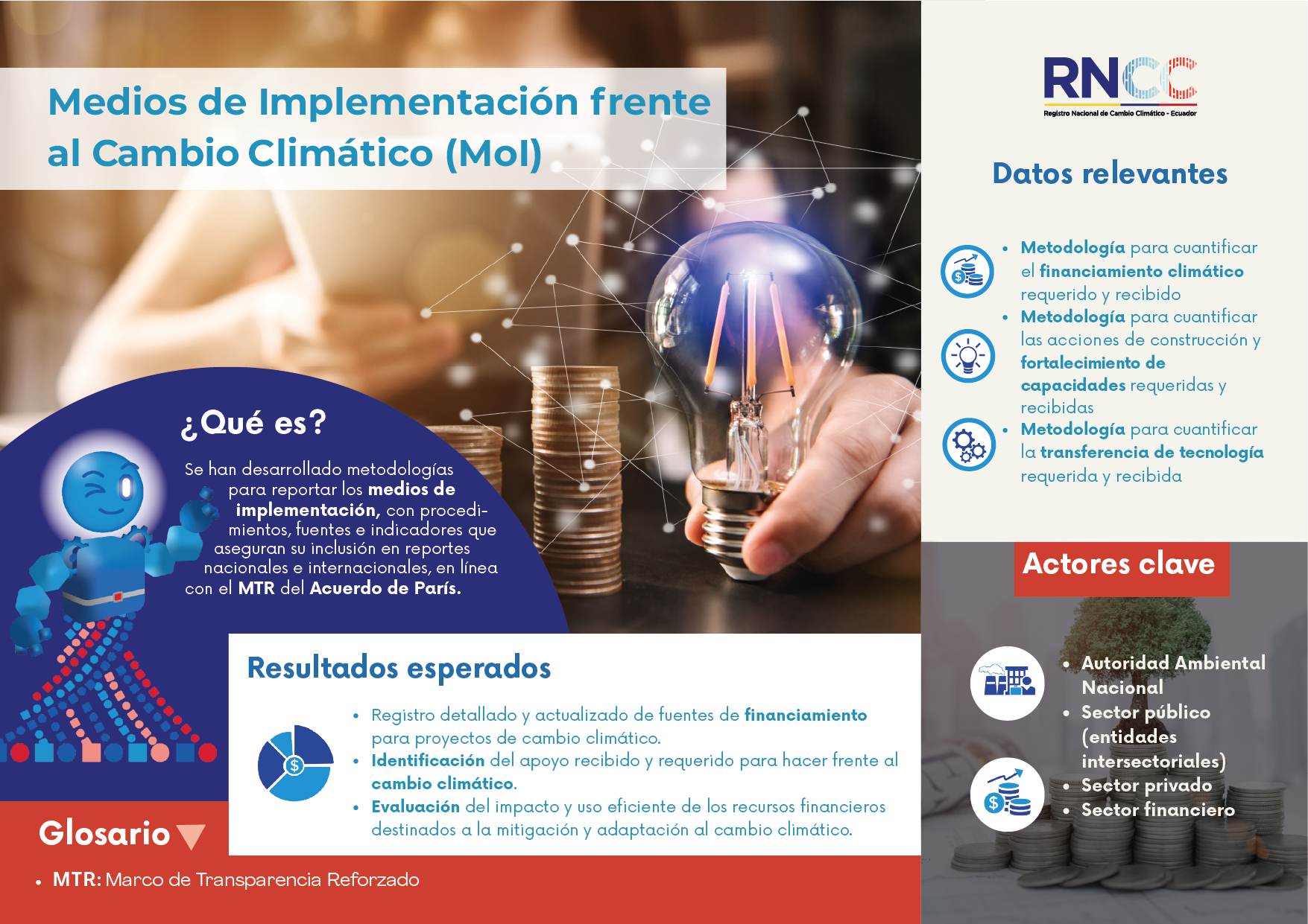 Los Medios de Implementación (MOI, por sus siglas en inglés), comprende la información relacionada con el apoyo requerido, recibido y/o movilizado por el Ecuador en forma de financiamiento climático, desarrollo y transferencia de tecnología, y fortalecimiento y construcción de capacidades, para implementar acciones climáticas.