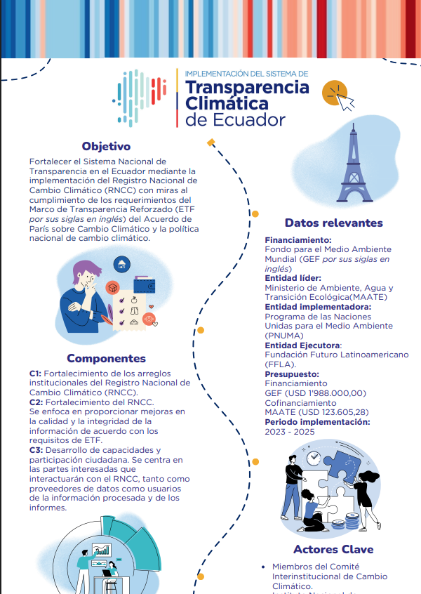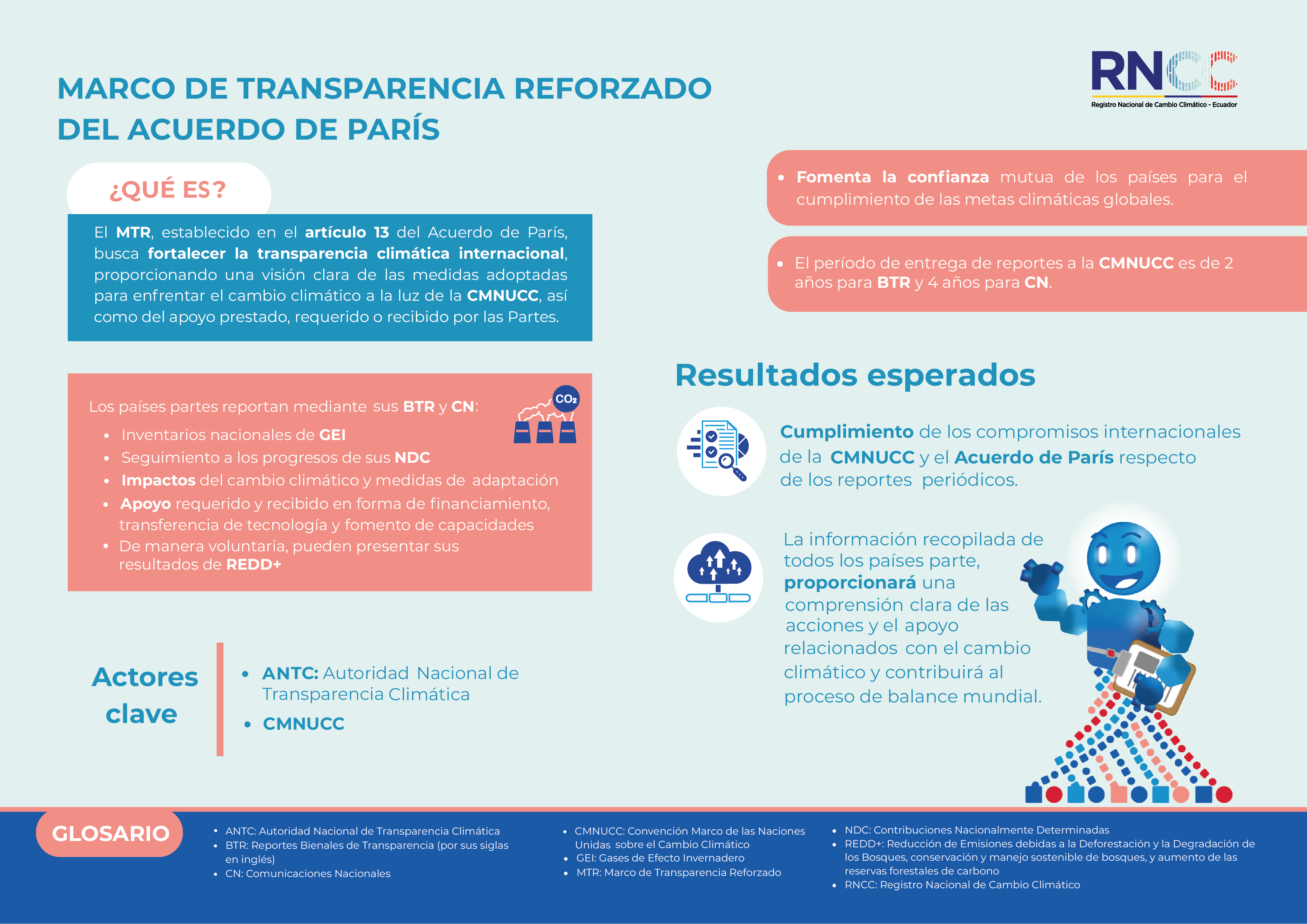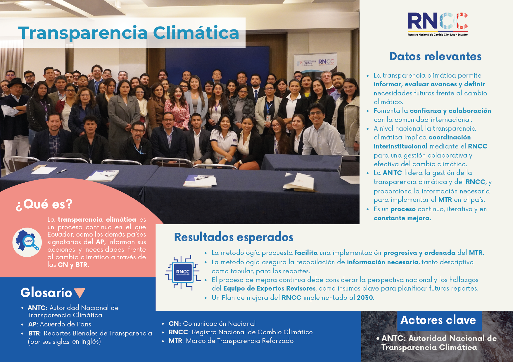 La transparencia climática es un proceso integral y continuo mediante el cual Ecuador reporta periódicamente sus acciones y necesidades para abordar el cambio climático. Este proceso se refleja en las Comunicaciones Nacionales y los Reportes Bienales Transparencia formulados siguiendo lineamientos internacionales que garantizan la rendición de cuentas y el cumplimiento de los objetivos estipulados en el Acuerdo de París.